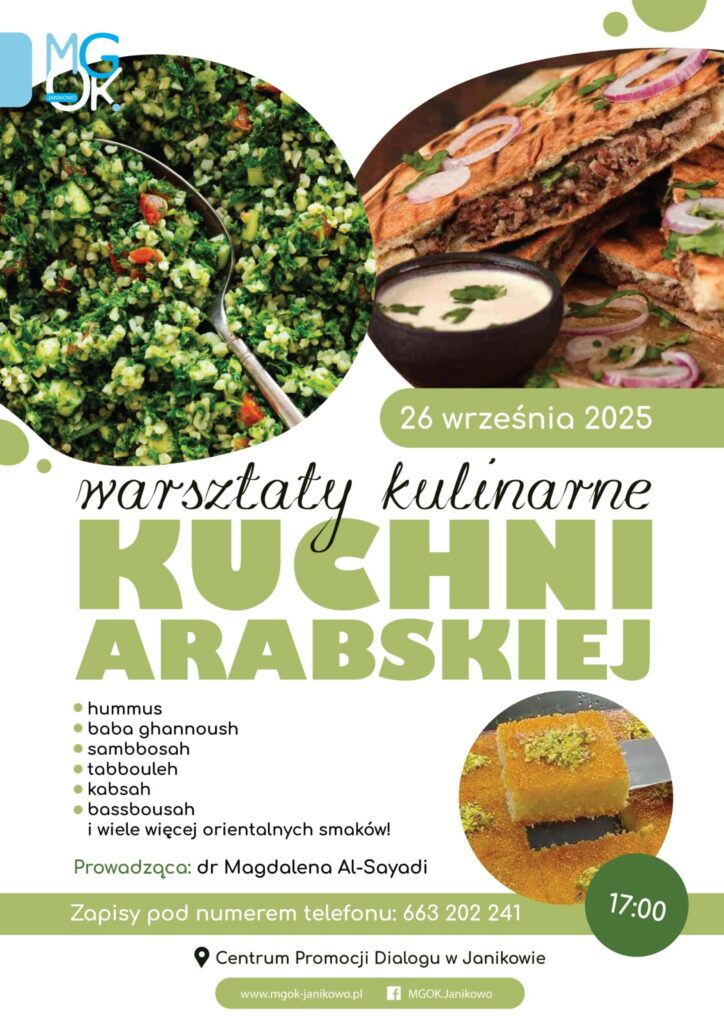 26 września mury Centrum Promocji Dialogu ponownie gościły Panią Magdę Al-Sayadi. Tym razem jednak odbyły się wyjątkowe warsztaty kulinarne dla chętnych mieszkańców miasta. Uczestnicy mieli okazję odkrywać orientalne smaki kuchni arabskiej i wspólnie przygotować m.in.: hummus, baba ghannoush, samboosah, tabbouleh, kabsah bassbousah.