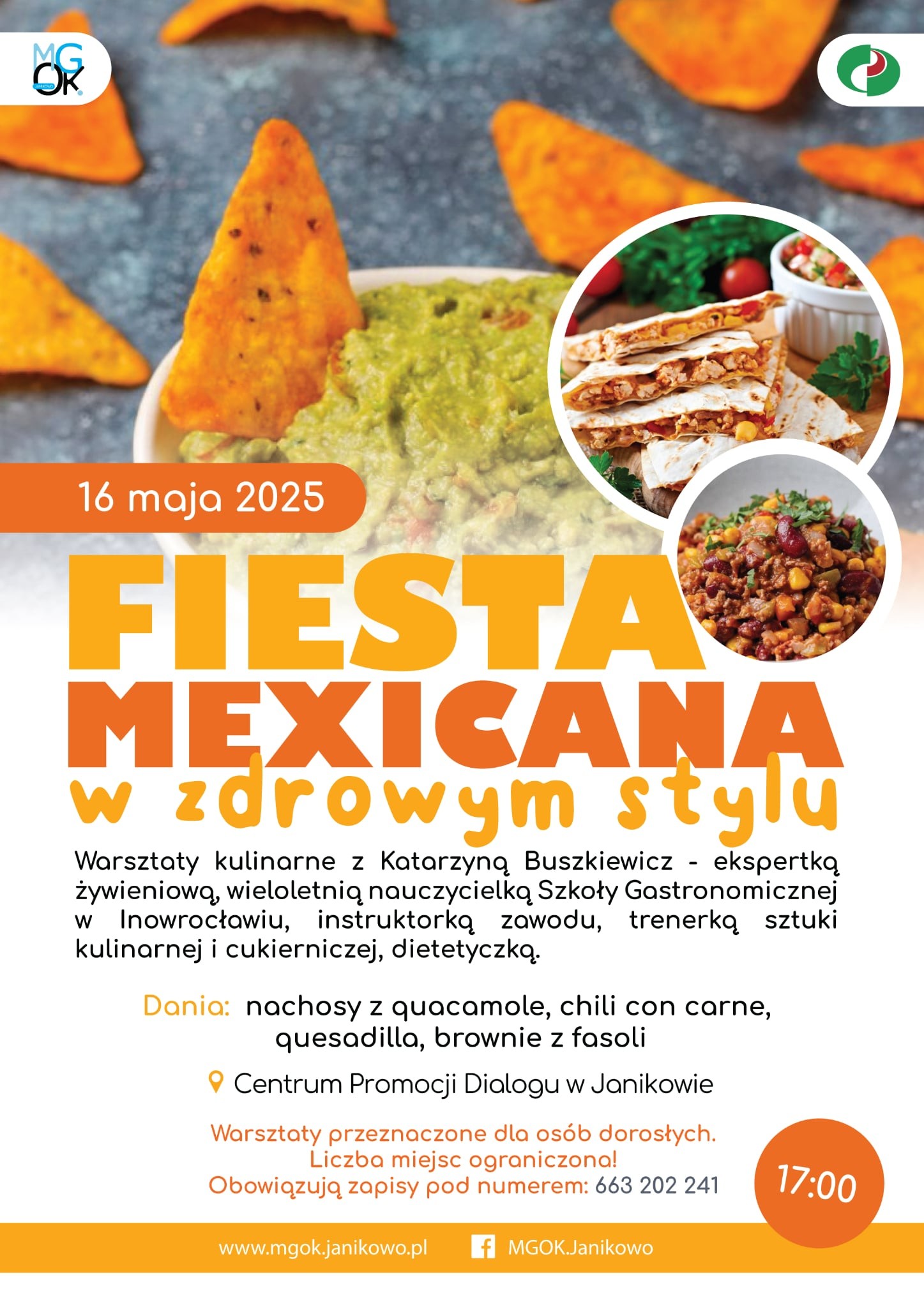 Warsztaty kulinarne z Katarzyną Buszkiewicz, które odbędą się 16 maja o godz. 17:00 w Centrum Promocji Dialogu w Janikowie! Katarzyna przeniesie uczestników do słonecznego Meksyku, ale w wersji zdrowej i lekkiej. Potrawy zaplanowane w trakcie trwania warsztatów: Nachosy z quacamole Chili con carne Quesadillę brownie z fasoli Katarzyna Buszkiewicz to dietetyczka i twórczyni inowrocławskiego gabinetu „Apetyt …