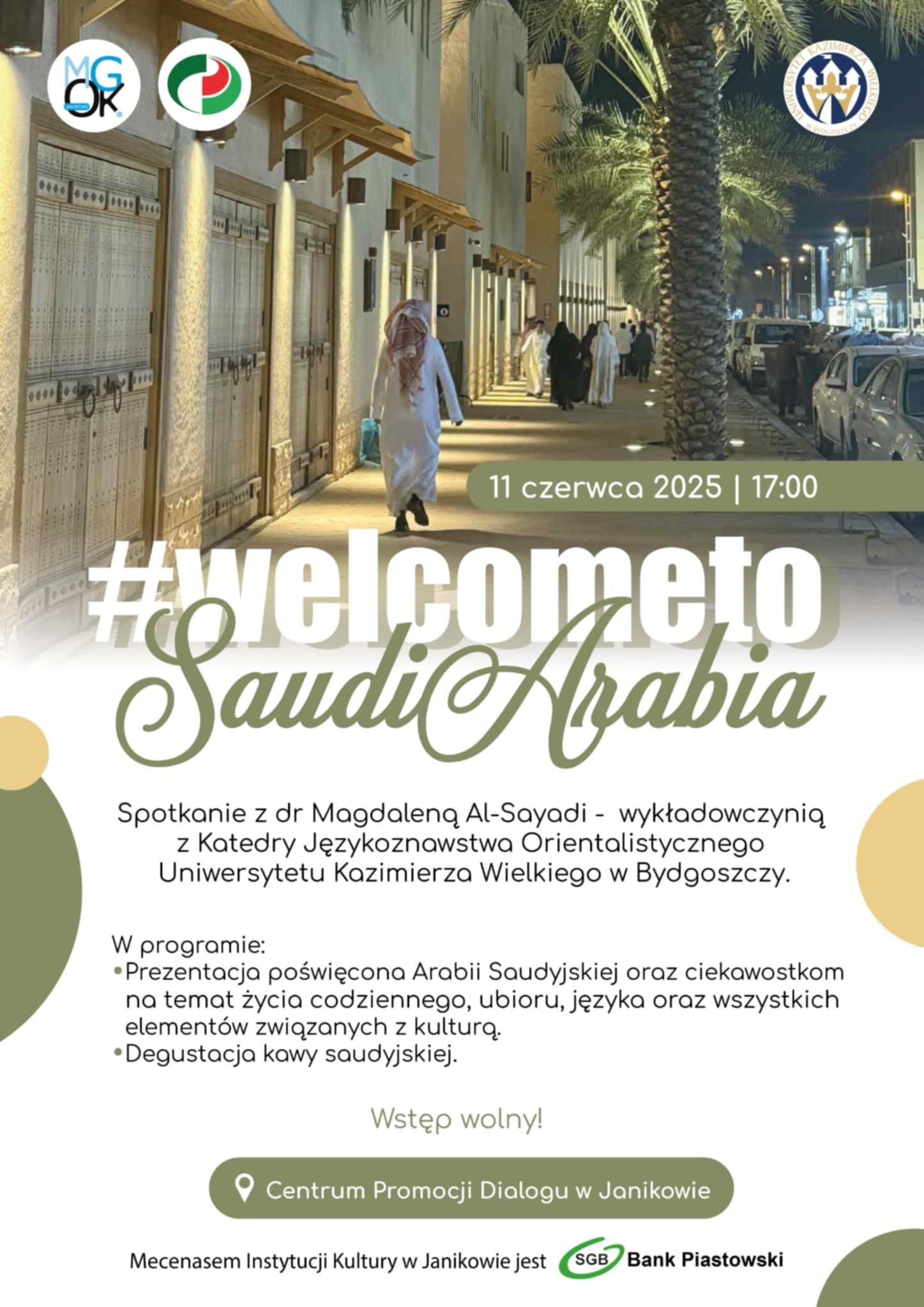 11 czerwca w Centrum Promocji Dialogu w Janikowie odbyło się wyjątkowe spotkanie z panią dr Magdaleną Al-Sayadi- wykładowczynią z Katedry Językoznawstwa Orientalistycznego Uniwersytetu Kazimierza Wielkiego w Bydgoszczy. Podczas prelekcji pn. Welcome to Saudi Arabia uczestnicy mieli okazję poznać fascynujące ciekawostki na temat życia codziennego, ubioru, języka oraz wielu innych aspektów kultury saudyjskiej. Spotkaniu towarzyszyła barwna …